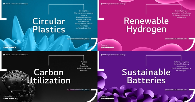 LG화학은 3월 16일부터 5월 1일까지 친환경 플라스틱, 재생 수소, 탄소 포집·활용, 차세대 전지소재 등 총 4개의 분야에서 혁신 기술 아이디어를 접수 받는다.
