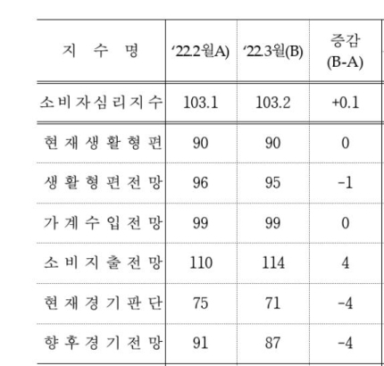 한국은행이 29일 발표한 '2022년 3월 소비자 동향조사 결과'에 따르면 3월 소비자심리지수(CCSI)는 103.2로 전달보다 0.1포인트(p) 상승했다. 지난달에는 코로나19 확진자 급증 영향으로 전달보다 1.3p 하락했지만 한 달 만에 상승 전환했다. CCSI는 소비자동향지수(CSI)를 구성하는 15개 지수 가운데 6개 지수를 이용해 산출한 지표다. 100보다 높으면 장기평균(2003∼2021년)과 비교해 소비 심리가 낙관적이라는 뜻이다.