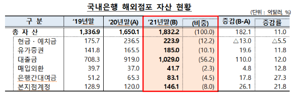 13일 금융감독원이 발표한 '2012년 국내 은행의 해외점포 경영현황 및 현지화지표 평가 결과'에 따르면 지난해 말 기준 국내 은행들의 해외 점포 총자산은 1832억2000만달러로 1년 전(1650억1000만달러)보다 182억1000만달러(11%) 증가했다.