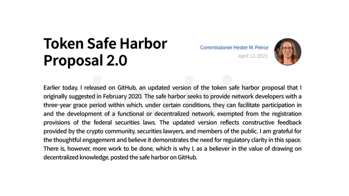 하위테스트의 실효성에 의문점이 제기되자 이 간극을 채우기 위해 나온 것이 헤스터 퍼스 SEC 위원의 토큰 세이프 하버 조항이라고 리포트는 설명한다. 토큰 세이프 하버 조항은 블록체인 네트워크가 탈중앙화 네트워크로 발전하는 데 시간이 걸린다는 점을 감안해 특정 조건 하에 증권법 적용을 3년간 면제받도록 하는 제도이다.