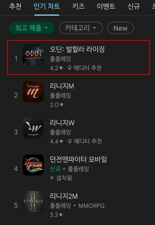 [FETV=박제성 기자] 카카오게임즈의 '오딘: 발할라 라이징'(오딘)이 구글 플레이 스토어 매출 1위를 재탈환했다. 오딘은 출시된 지 1년 가까이 된 가운데 인기를 과시하고 있다.