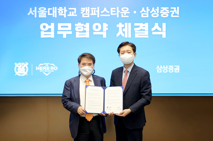 지난달 29일 진행된 협약식에는 사재훈 삼성증권 채널영업부문장 부사장과 서울대학교 김태완 캠퍼스타운 사업단장이 참여했다.