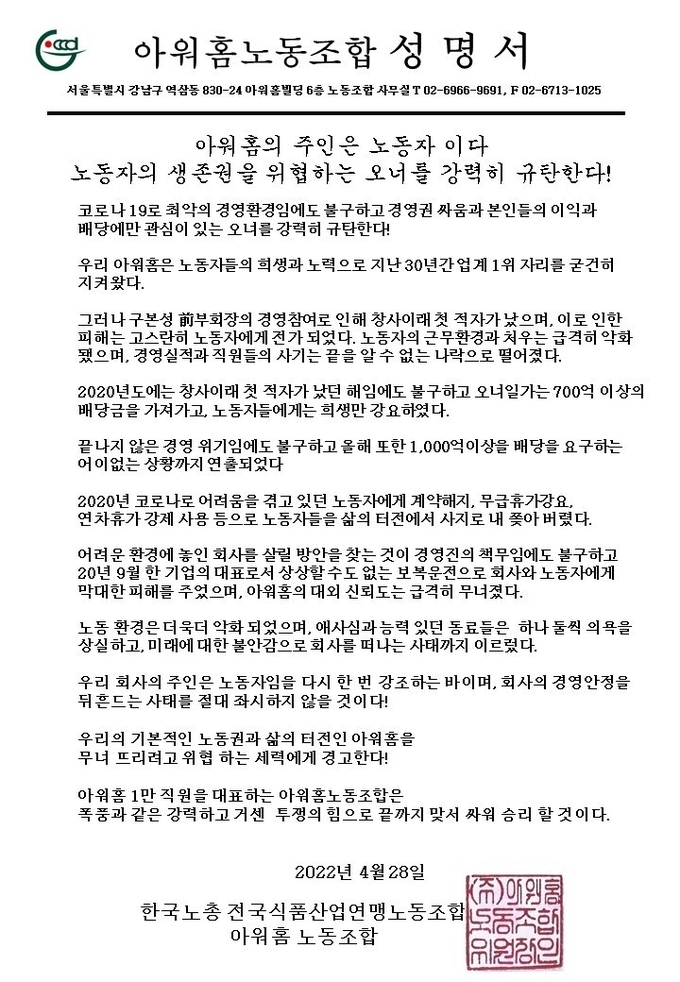 노조는 “구본성 전 부회장이 경영참여로 창사 이래 첫 적자가 났으며 이로 인한 피해는 고스란히 노동자에게 전가됐다”며 “끝나지 않은 경영 위기임에도 불구하고 올해 1000억원 이상을 배당을 요구하는 어이없는 상황까지 다시 연출됐다”고 지적했다. 이어 “2020년 9월 한 기업 대표로서 상상할 수도 없는 보복운전으로 회사와 노동자에게 막대한 피해를 줬고, 아워홈의 대외 신뢰는 급격히 무너졌다”고 덧붙였다. 노조는 “회사의 경영안정을 뒤흔드는 사태를 절대 좌시하지 않을 것이다”고 강조했다.