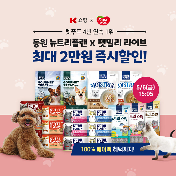 [FETV=김수식 기자] K쇼핑이 동원F&B의 펫푸드 전문브랜드 ‘뉴트리플랜’과 함께 애묘·애견상품을 엄선해 선보이는 ‘펫밀리’ 라이브커머스를 6일 론칭한다.