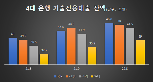 시중은행 한 관계자는 "기술금융은 가계대출 대체 영업 대상인 기업대출과 맞닿아 있고, 최근 금융그룹들이 대출·투자를 늘리고 있는 기술혁신 스타트업과도 연결돼 있어 포기할 수 없는 부분"이라며 "성장성을 보고 기업에 투자하는 은행이라는 이미지도 무시할 수 없어 은행간 기술신용대출을 늘리기 위한 경쟁은 지속될 것"이라고 말했다.