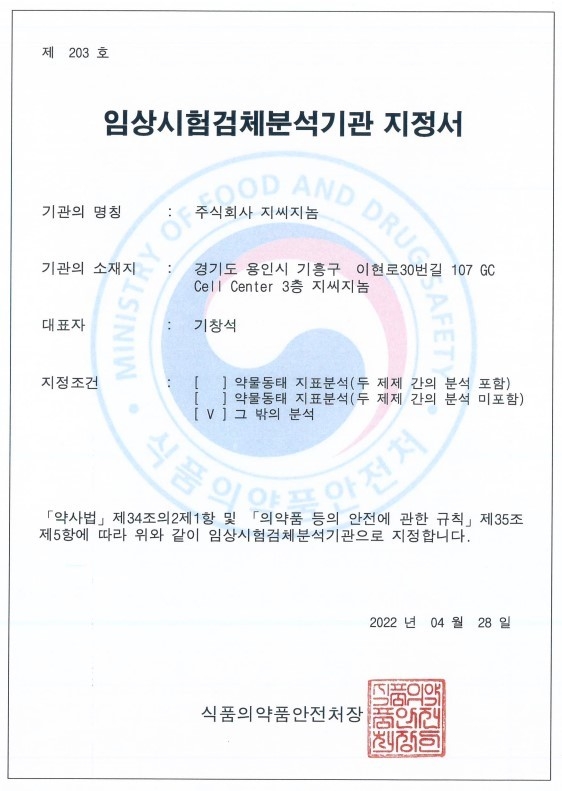 기창석 GC지놈 대표는 “암 유전자검사 및 AI 액체생검 기술력 강화를 위해 R&D 투자를 아끼지 않은 결과, 식약처가 요구하는 엄격한 기준을 충족해 임상시험검체분석기관(GCLP)로 지정될 수 있었다”며 "환자 진료를 위한 임상검사뿐만 아니라 신약 개발을 위한 임상시험 검체분석까지 실시하는 국내 유일의 임상유전체 전문분석기관으로서 항암제 및 희귀 유전질환 신약 개발에 적극 참여해 국내외 제약산업 발전에 기여할 것"이라고 말했다.