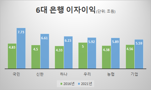 은행별로는 국민은행의 이자이익이 가장 크게 늘었다. 국민은행의 작년 이자이익은 7조7285억원으로 처음으로 7조원대를 기록했다. 2016년(4조8289억원)보다 2조8996억원 증가했다. 신한은행도 2조원 이상 불었다. 지난해 이자이익은 6조6118억원으로 5년 전(4조5041억원)보다 2조1077억원 늘어났다. 같은 기간 하나은행이 4조3287억원에서 6조1506억원으로 1조8219억원 증가했으며, 농협은행은 4조3821억원에서 5조8908억원으로 1조5087억원 늘었다. 기업은행과 우리은행은 각각 1조314억원, 903억원 이자이익이 증가했다.