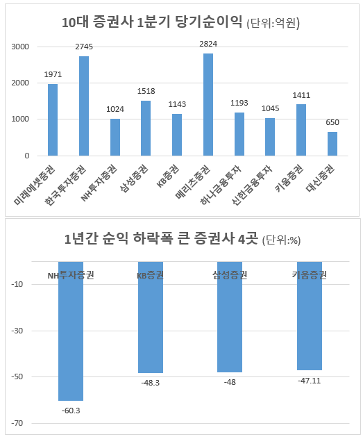 16일 금융투자업계에 따르면 10대 증권사의 올 1분기 당기순이익 합계는 1조5524억원으로 집계됐다. 10대 증권사 중 메리츠증권을 제외한 9곳은 1년 동안 평균 38.1%의 순익이 줄었다. 아직 실적을 발표를 하지 않은 대신증권은 전년 동기 대비 33%(650억원) 줄어든 순익을 거둘 것으로 추정된다.