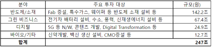 반도체 및 소재 분야 투자는 주로 반도체 경쟁력을 강화하기 위한 반도체 생태계 조성에 집중됐다. 용인 반도체 클러스터 조성을 비롯해 반도체 Fab(제조·공정) 증설, 특수가스와 웨이퍼 등 소재∙부품∙장비 관련 설비 증설 등이 투자 대상이다.
