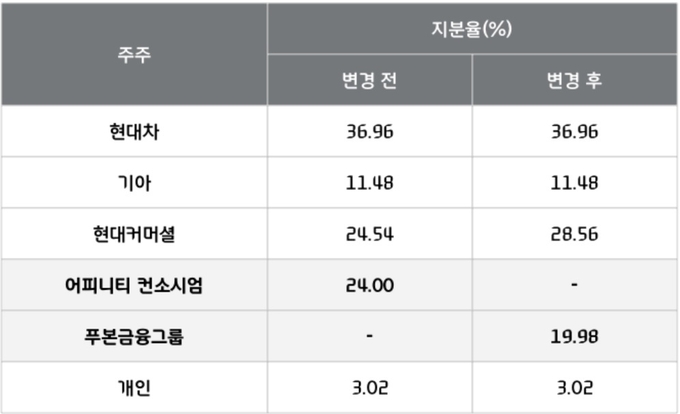 현대커머셜은 현대카드 주식 28.56%를 보유한 2대 주주다. 어피니티 컨소시엄 보유 지분 중 푸본금융그룹이 매입하지 않은 나머지 지분 4%가량을 인수했다.