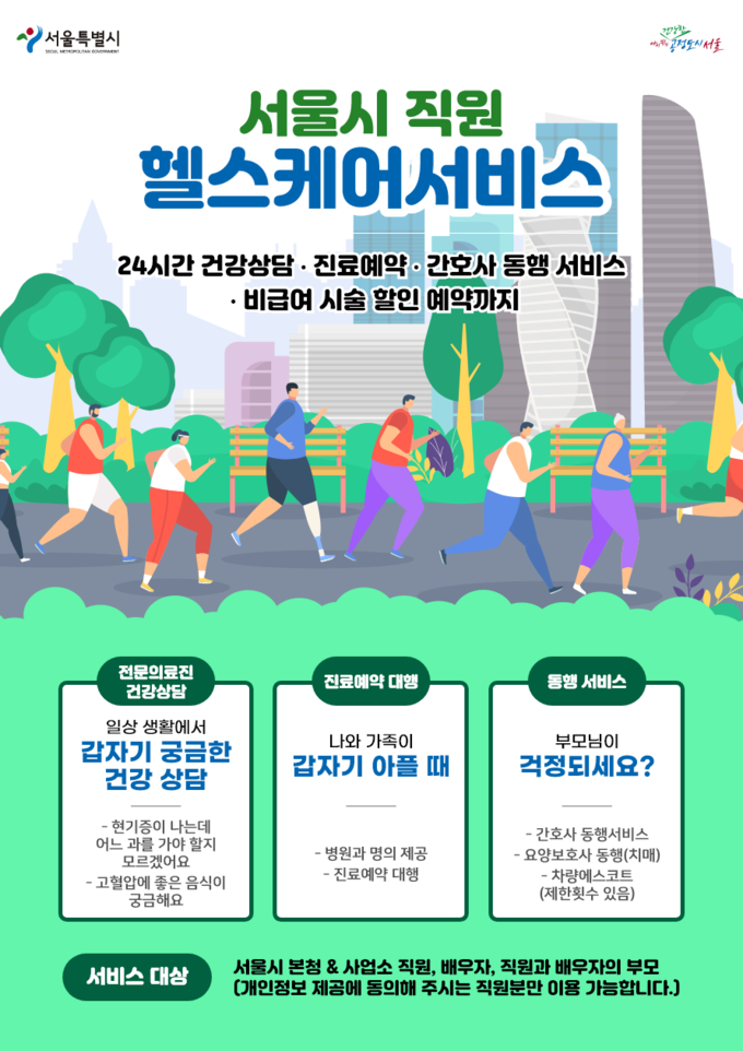 ‘서울시 직원 헬스케어 서비스’는 GC케어가 서울시 본청∙사업소 직원 및 배우자, 자녀, 직원과 배우자의 부모를 대상으로 제공하는 개인 맞춤형 통합 헬스케어 프로그램이다.