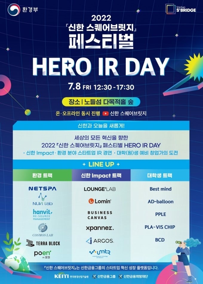 히어로 IR 데이는 서울 한강 노들섬에서 진행되며, 온라인은 '신한 스퀘어브릿지' 유튜브 채널을 통해 생중계할 예정이다. 신한 스퀘어브릿지와 창업에 관심이 있는 누구나 신청 가능하며, 온·오프라인 참관등록은 내달 8일까지 신한 스퀘어브릿지 서울 홈페이지를 통해 할 수 있다. 오프라인 현장 참여 좌석은 선착순 마감 한다.