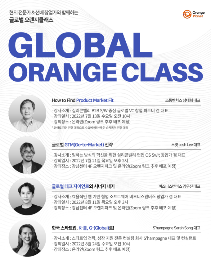 이번 글로벌 오렌지클래스는 7월, 8월 각 2회 씩 예정 돼 있다. 7월 13일, 8월 24일 강연은 온라인에서 진행되고, 7월 21일, 8월 11일 강연은 오렌지플래닛에서 오프라인으로 진행된다.