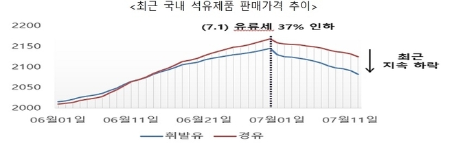 전날인 13일 기준 전국 주유소의 평균 판매가는 휘발유 L당 2073.1원, 경유 2117.2원으로 지난 6월 30일 대비 각각 71.8원과 50.5원 내려 37% 유류세 효과를 톡톡히 보고 있다.