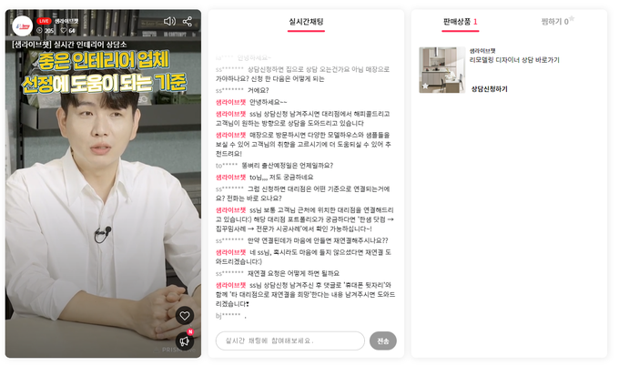 샘라이브챗의 핵심 기능은 ‘실시간 상담’이다. 보통 라이브커머스는 방송 시간에만 상담·구매가 가능하다. 판매 시간이 지난 방송은 사실상 ‘다시보기’ 서비스만 제공한다. 반면 모든 샘라이브챗 시청자는 정보 영상 콘텐츠를 통해 매일 오전 9시부터 24시까지 오픈채팅 기반의 실시간 전문 상담을 받을 수 있다. 특히 추가 상담을 원한다면 상담원을 통해 거주지 인근의 리하우스 디자이너(RD)·대리점과 직접 연결해 주는 서비스도 제공받을 수 있다.