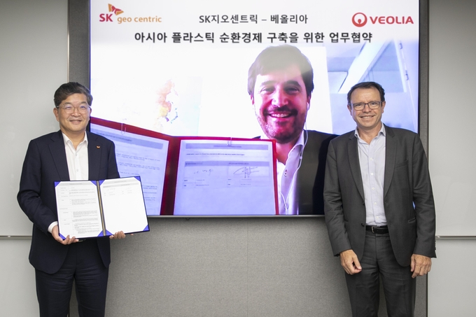 SK지오센트릭과 베올리아아시아는 지난 22일 서울시 종로구 SK그린캠퍼스(종로타워)에서 열린 화상회의에서 아시아 시장 내 순환경제 사업 활성화를 위한 양해각서(MOU)를 체결했다.