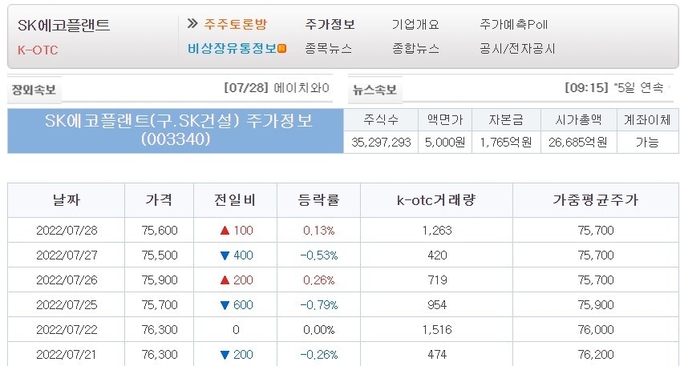 투자은행(IB) 관계자는 “SK에코플랜트는 과거 장외에서 건설사로서 가치를 인정받았지만 작년 EMC홀딩스를 인수한 후엔 친환경 기업으로 평가받으며 거래 배수가 크게 뛰어올랐다”며 “SK그룹 측에선 SK에코플랜트 지분 문제를 풀고 싶겠지만 시장에선 아직 그 정도 장외 가치를 인정하기는 어렵다는 분위기도 많다”고 말했다.