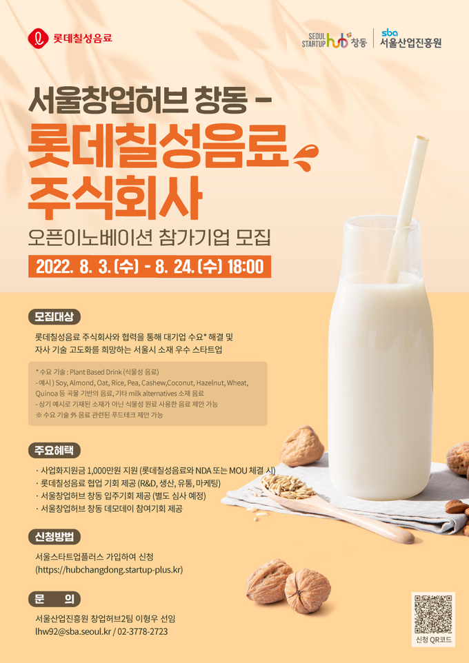 [FETV=김수식 기자] 롯데칠성음료가 서울산업진흥원과 손잡고 식물성 음료 개발을 목표로 대기업‧스타트업 상생협력을 통한 ‘롯데칠성음료x서울창업허브 창동 오픈이노베이션’의 참가 기업 모집에 나선다.