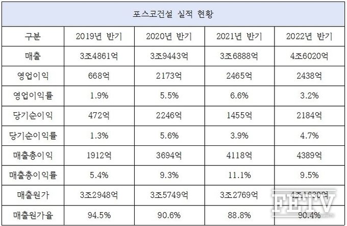 한 사장 지휘 아래 마진율도 급격한 상승세를 보이고 있다. 포스코건설의 영업이익률은 2019년 반기 기준 1.9%에서 2020년(반기) 5.5%, 2021년(반기) 6.6%, 2022년(반기) 3.2%를 기록했다. 원자재 가격 인상과 함께 매출원가율이 오르면서 영업이익률이 전년 동기대비 3% 가량 감소했다. 하지만 이는 3년 전과 비교하면 여전히 3배가량 높은 수치다.