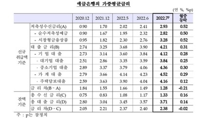 한국은행이 30일 발표한 '7월 금융기관 가중평균금리 자료'에 따르면 지난달 지난달 예금은행의 가계대출 금리(가중평균·신규취급액 기준)는 연 4.52%로 한 달 새 0.29%포인트(p) 올랐다. 2013년 3월(4.55%) 이래 9년 4개월 만에 가장 높은 수준이다. 같은 기간 기업대출은 4.12%로 0.28%p 높아졌다. 금리가 5% 이상인 비중은 16.3%로 2013년 6월 이후 최고치를 기록했다.