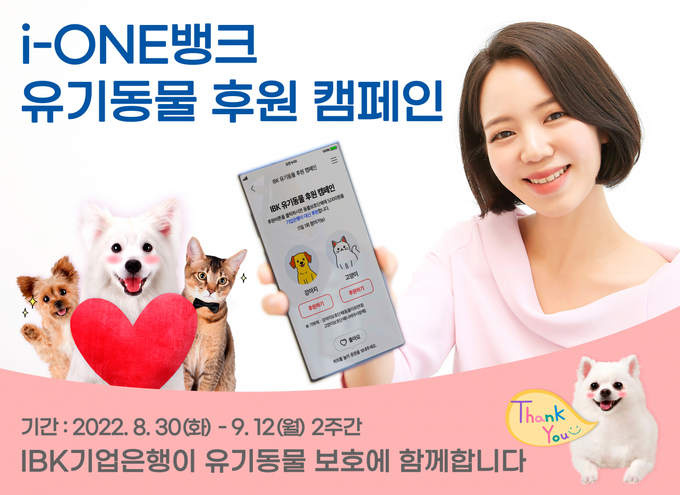 [FETV=권지현 기자] IBK기업은행은 모바일 플랫폼 아이원(i-ONE) 뱅크 내 유기동물 후원코너를 만들어 고객참여형 캠페인을 진행하고 유기동물 보호소에 후원금을 기부한다고 31일 밝혔다.