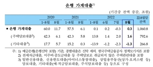 한국은행이 8일 발표한 '2022년 8월 중 금융시장 동향'에 따르면 지난달 말 기준 예금은행의 가계대출 잔액은 1060조8000억원으로, 한 달 전보다 3000억원 늘었다.