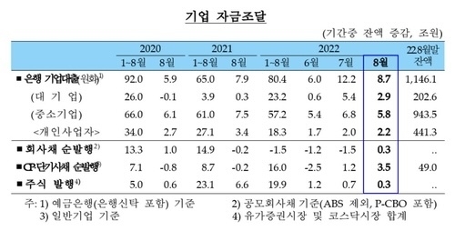 8월 말 기업의 은행 원화 대출 잔액은 1146조1000억원으로 한 달 새 8조7000억원 늘었다. 증가폭은 전월과 비교해 계절적 증가요인이 사라져 축소됐지만, 8월 기준으론 2009년 6월 통계가 시작된 이후 가장 컸다.