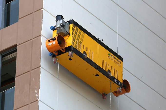 현대엔지니어링과 도장전문업체 제이투이앤씨가 공동개발한 '외벽도장로봇'은 건물에 설치된 와이어를 따라 수직 승하강하며, 4개의 노즐로 도료를 분사해 원격으로 도장 작업을 가능하게 해주는 스마트 건설장비다.