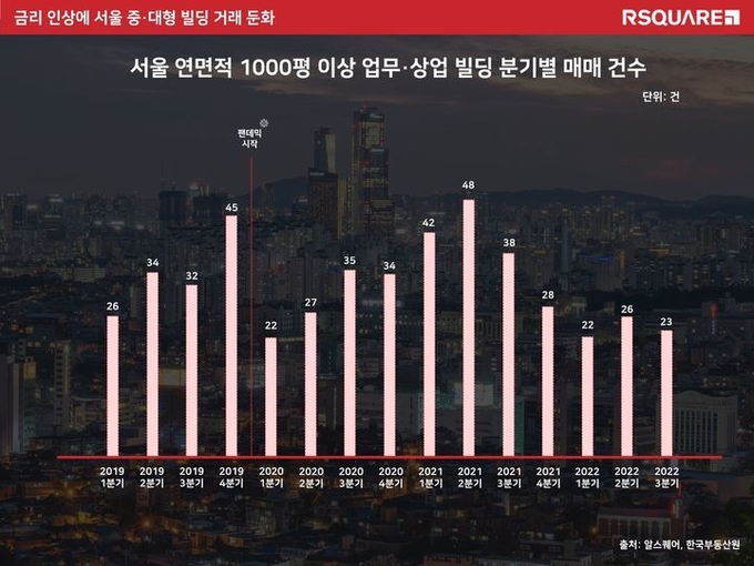 17일 상업용 부동산 플랫폼기업 알스퀘어가 한국부동산원을 통해 2019년부터 올해 3분기까지 서울 연면적 1000평 이상 업무·상업용 빌딩 분기별 거래건수를 분석한 결과, 올해 3분기(11일 기준)는 23건으로 지난해 같은 기간보다 39.5% 감소했다. 올해 2분기 거래도 26건으로, 1년 전과 비교해 45.8% 줄었다.