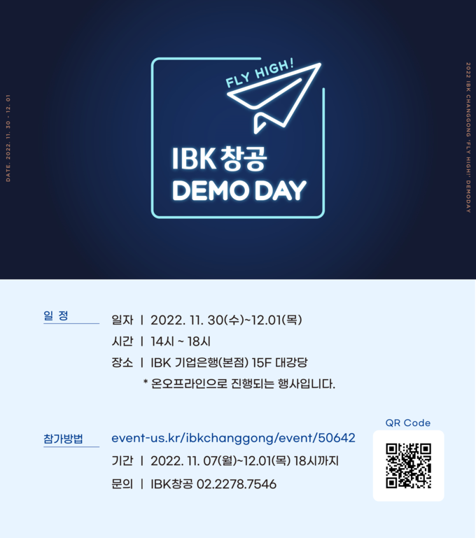 본 행사는 온·오프라인 하이브리드로 진행되고, IBK창공 유튜브 채널 또는 이벤터스 웨비나 채널을 통해 실시간으로 송출된다. 참가신청은 12월 1일까지 IBK창공 홈페이지에서 가능하다.