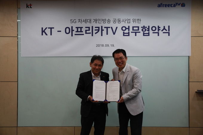 KT는 지난 19일 아프리카TV와 업무협약을 체결하면서 5G 시대 콘텐츠의 다양성 확보에 나섰다. 아프리카TV의 콘텐츠와 KT의 5G 기술력을 결합하겠다는 취지다.
