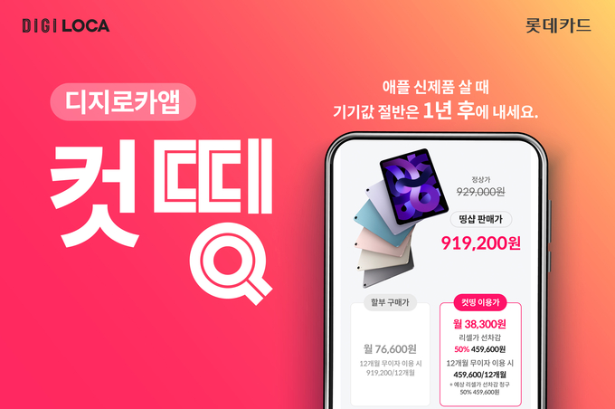 [FETV=장기영 기자] 롯데카드는 애플 기기값의 절반을 1년 후에 내는 ‘컷띵’ 이벤트를 ‘디지로카’ 애플리케이션을 통해 진행한다고 12일 밝혔다.