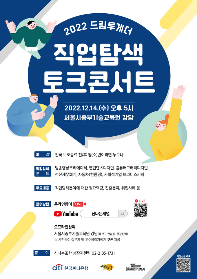 [FETV=권지현 기자] 한국씨티은행은 신나는조합과 오는 14일 오후 서울 용산구 소재 서울중부기술교육원에서 자립준비청소년을 위한 ‘2022드림투게더 직업 탐색 토크콘서트’를 개최한다고 13일 밝혔다.