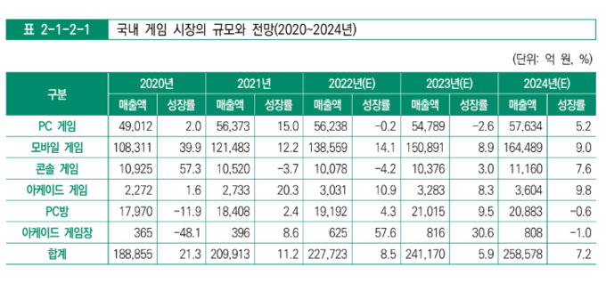 이 중 모바일 게임은 2021년 전체 게임시장의 57.9%를 차지했다. 매출은 12조 1483억원으로 집계됐다. PC게임은 점유율 26.8%, 매출 5조6373억원을 기록했으며, 콘솔게임 1조520억원, 아케이드 게임 매출은 2733억원을 기록했다.