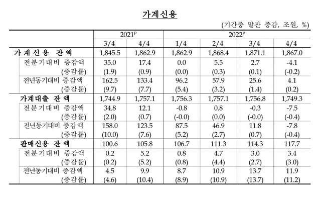 반면 4분기 판매신용 잔액은 117조7000억원으로 다시 역대 최대 기록을 세웠다. 연말 소비 회복 등으로 신용카드 사용이 늘어난 영향이다.