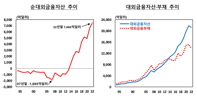대외금융자산보다 대외금융부채가 더 많이 줄면서 순대외금융자산은 작년 말 기준 7466억달러로 2021년 말 대비 870억달러 증가했다. 연말 기준으로 2021년에 이어 2년째 역대 최대를 기록했다.