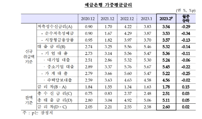 한국은행이 31일 발표한 ‘2월 금융기관 가중평균 금리’ 통계에 따르면 지난달 예금은행의 신규 취급액 기준 대출 금리는 연 5.32%로 한 달 전보다 0.14%포인트(p) 낮아졌다. 지난해 11월 연 5.64%로 고점을 찍은 후 같은 해 12월 연 5.56%, 지난 1월 5.46%로 떨어진 후 석 달 연속 하락한 수치다.