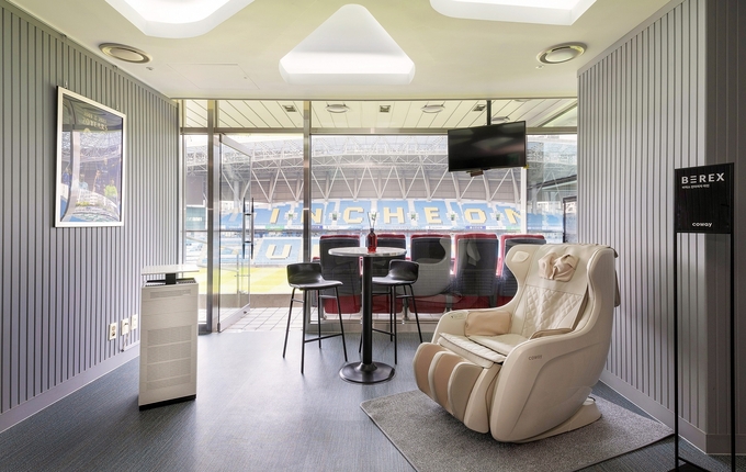 코웨이 스카이박스는 인천 중구 도원동에 위치한 인천유나이티드 홈구장인 인천축구전용경기장에 마련됐다. 코웨이 비렉스 안마의자 마인과 노블 공기청정기를 설치해 쾌적한 환경에서 경기를 관람해 코웨이 제품까지 경험해 볼 수 있는 것이 특징이다.