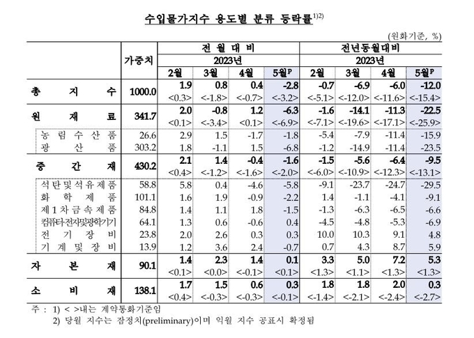 한국은행이 14일 발표한 수출입물가지수 통계에 따르면 5월 기준 수입물가지수(원화 기준 잠정치·2015년 수준 100)는 135.54로 4월(139.45)보다 2.8% 하락했다. 수입물가지수는 지난 2월부터 석달 연속 상승세를 유지하다 넉 달 만에 하락세로 돌아섰다. 특히 전년 동월 대비 하락 폭은 -12.0%로 2020년 5월(-13.0%) 이후 가장 컸다.