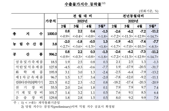 수출물가지수는 지난 2월부터 전월 대비 석 달 연속 올랐는데, 넉 달 만에 하락으로 전환한 것이다. 1년 전과 비교하면 11.2% 낮은 수준으로, 지난 2010년 3월(-11.3%) 이후 13년 2개월 만에 전년 대비 하락 폭이 가장 컸다.