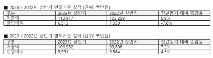 2023년 2분기 연결기준 매출은 591억원, 영업이익은 44억원을 기록했다. 이는 전년 동기(2022년 2분기) 대비 매출 49억원, 영업이익 6억원 증가한 수치다. 별도 기준으로는 매출 571억원, 영업이익은 58억원으로, 전년 동기 대비 매출 51억원, 영업이익 3억원 각각 증가했다.