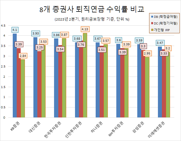 확정급여형(DB)은 KB증권이 4.1%로 가장 높았다. 대신증권 3.93%, 한국투자증권 3.86%, 신한투자증권 3.68%, 하나증권 3.67%, NH투자증권 3.6%, 삼성증권 3.59%, 미래에셋증권 3.47% 순이었다. 8개사의 DB형 평균 수익률은 3.74%였다. 한편 8월 24일 발표된 중앙은행 기준금리는 3.5%다.
