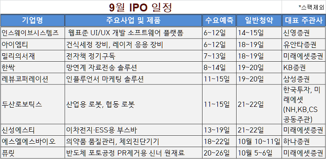 4일 금융투자업계에 따르면 이번 달 유가증권시장과 코스닥 상잔을 위해 ▲인스웨이브시스템즈 ▲아이엠티 ▲밀리의서재 ▲한싹 ▲레뷰코퍼레이션 ▲두산로보틱스 ▲신성에스티 ▲에스엘에스바이오 ▲퓨릿 등 9개 기업이 수요예측을 진행한다. 9개 기업 중 두산로보틱스 만이 코스피 상장을 목표로 하고 나머지 8개 기업은 코스닥 상장에 도전한다. 특히 연휴 전 주인 9월 셋째주(18∼22일)에는 7개 기업의 일반 청약이 몰려있다.