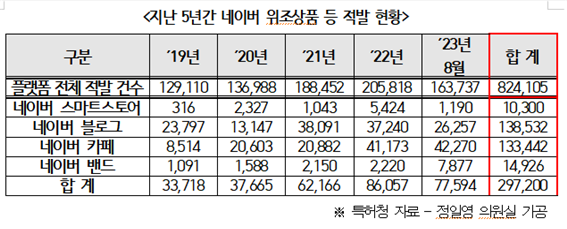 13일 더불어민주당 정일영 의원이 특허청에서 받은 ‘온라인플랫폼별 위조 상품 적발 현황’에 따르면, 지난 5년간 가품이 가장 많이 적발된 유통 플랫폼은 네이버였다. 네이버 플랫폼 내 부문별 가품 적발 건수는 블로그가 13만8532건으로 가장 많았다. 이어 카페(13만3442건), 밴드(1만4926건), 스마트스토어(1만300건) 순이었다. 플랫폼 기준 네이버 다음으로 가품 적발이 많은 곳은 인스타그램(29만3554건)이었다.
