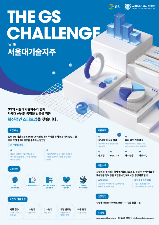 선발된 기업에게는 총 5억원이상의 직접투자, 창업 아이템 유관 GS현업전문가와 서울대 교수진에게 받을 수 있는 멘토링 기회가 제공된다.