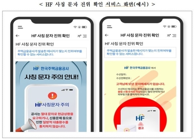 고객은 공사 홈페이지 또는 스마트주택금융 앱을 통해 문자를 받은 연락처와 수신 일자만 입력하면 공사에서 해당문자를 보냈는지 확인 할 수 있다. 이 경우에도 공사는 주민등록번호·계좌번호 등 다른 개인 정보 입력을 요구하지 않는다.