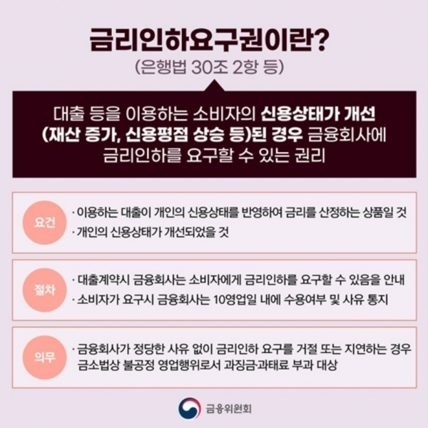 금리인하요구권이란 대출을 받은 개인 또는 기업의 신용상태, 상환능력 등이 대출 당시보다 크게 개선됐을 경우 금융기관에 대출 금리를 낮춰달라고 요구할 수 있는 제도다.