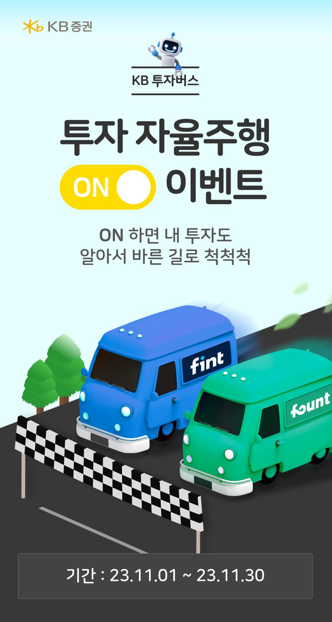 [FETV=심준보 기자] KB증권은 ‘자율주행 서비스’의 운용사 추가 및 투자 범위 확대 기념으로 11월 30일까지 ‘투자 자율주행 On’ 이벤트를 실시 중이다.