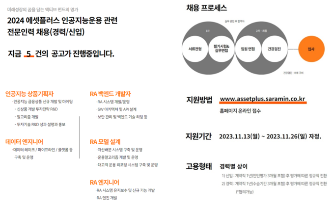 에셋플러스 채용담당자는 “미래혁신의 탐험에 인공지능분야의 열정과 넘치는 끼를 가진분들의 많은 지원을 기다린다"고 전했다. 채용지원은 오는 26일까지이며 회사홈페이지 또는 채용 전문사이트인 사람인을 통해 지원 가능하다.