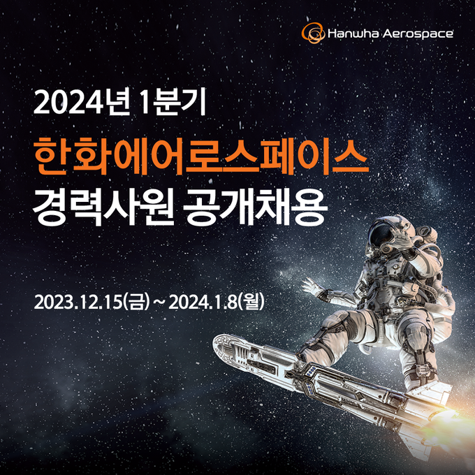 한화에어로스페이스는 15일부터 내년 1월 8일까지 제조, 생산기술, R&D(연구개발), 경영지원 등 전 직군에서 000명 규모의 '2024년 1분기 경력사원 공개채용' 서류 접수를 진행한다고 20일 밝혔다.